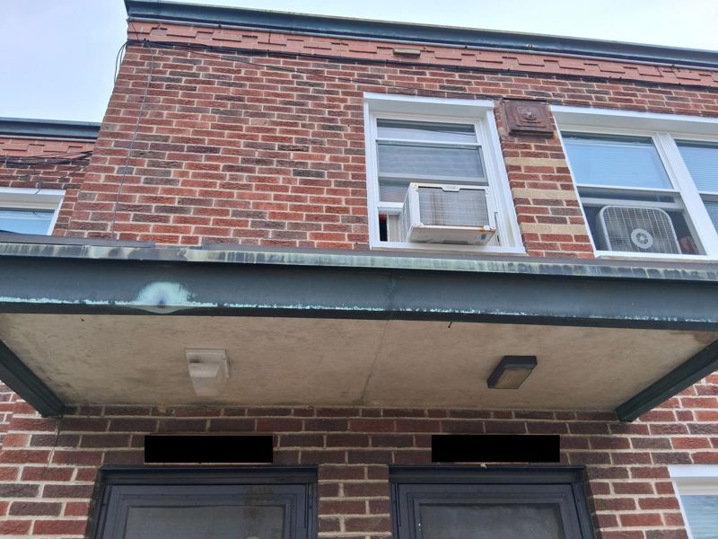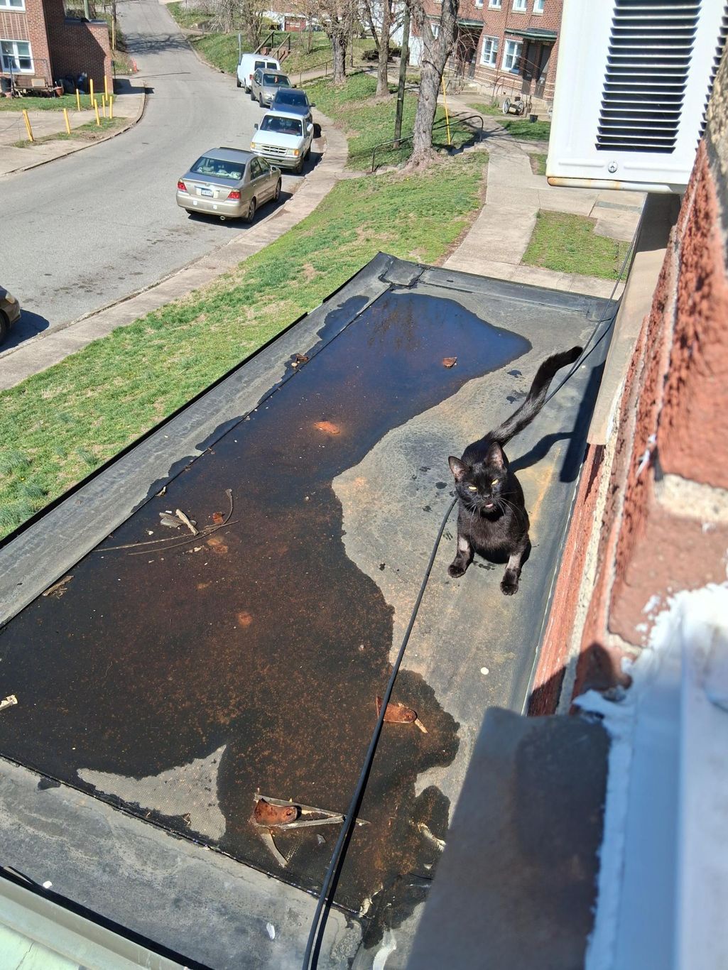 Well, Sunny figured out how to squeeze the accordion flap out of the way and slip out of our second story window onto a structure below the window. I'm not sure what to call it, it's not an awning or canopy; it's a solid, flat platform attached to the building that contains a light for our stoop and offers some basic weather protection while you're digging out your keys. I think of it as a sort of big shelf.