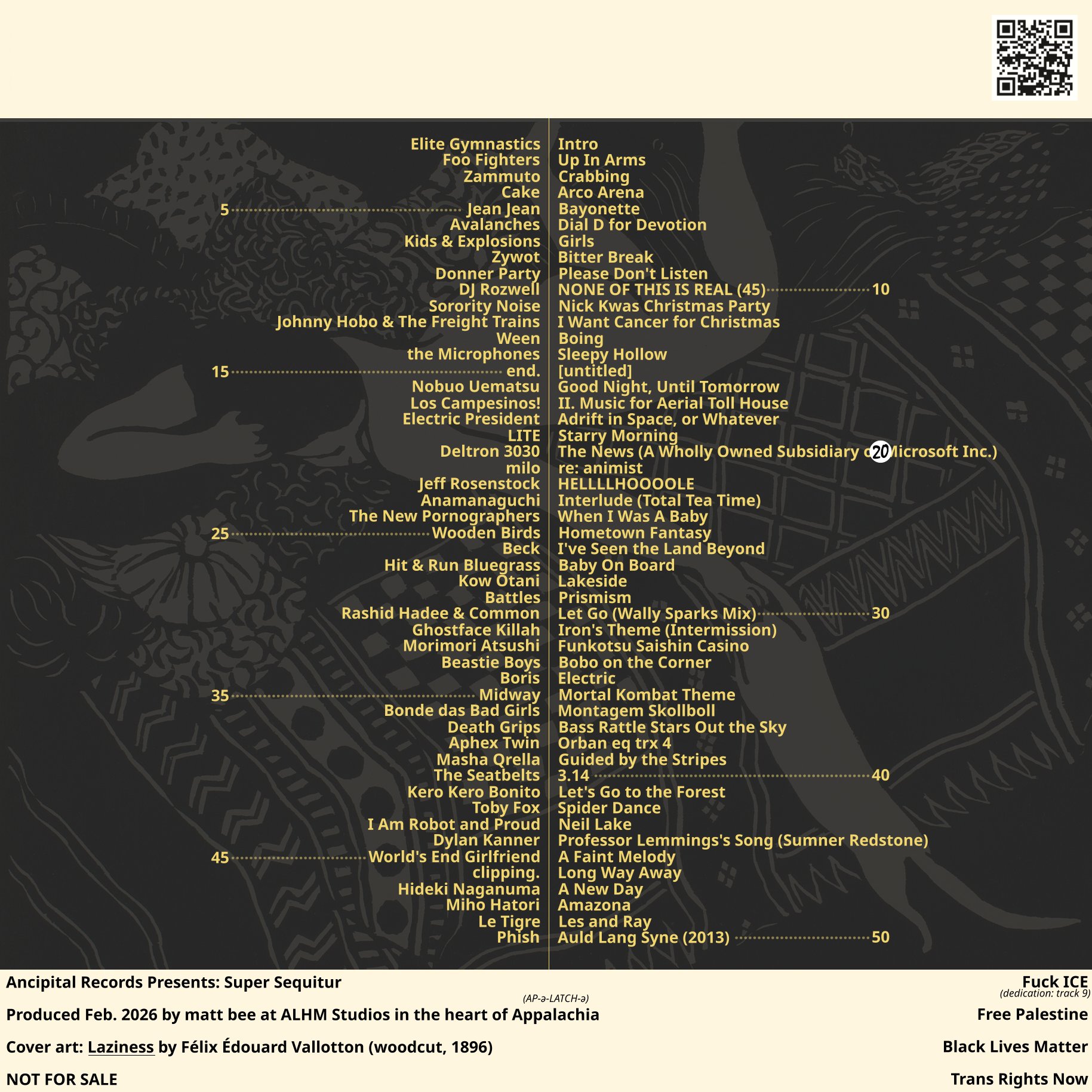 I think making compilations is a way people without musical skill can sort of participate in the creation process without letting it go to their heads. I have no delusions that I made the music on Super Sequitur, and although I've enjoyed listening to it, it hasn't replaced all other music for me. I'm proud of how well the tracks flow and how nicely the "story" comes together, but I don't listen and think "wow, I made music!" I think it's a healthier way to turn consumption of music into a participatory act. It's more satisfying than just making a playlist on someone else's platform, and far more rewarding than prompting a slop machine. I put a lot of work into Super Sequitur! I painstakingly combed my library for the best tracks that fit my constraints. I made a spreadsheet to track the playlist in progress and how much of my time budget I had spent. I added, dropped, arranged and re-arranged tracks exhaustively. For the cover, I combed through public domain art for hours looking for pieces that jumped out at me.4 I put at least a standard work day into designing the packaging. Is it perfect? No, but it looks and sounds like what I wanted to make, and I'm much prouder than if I had just told a computer to do it for me.