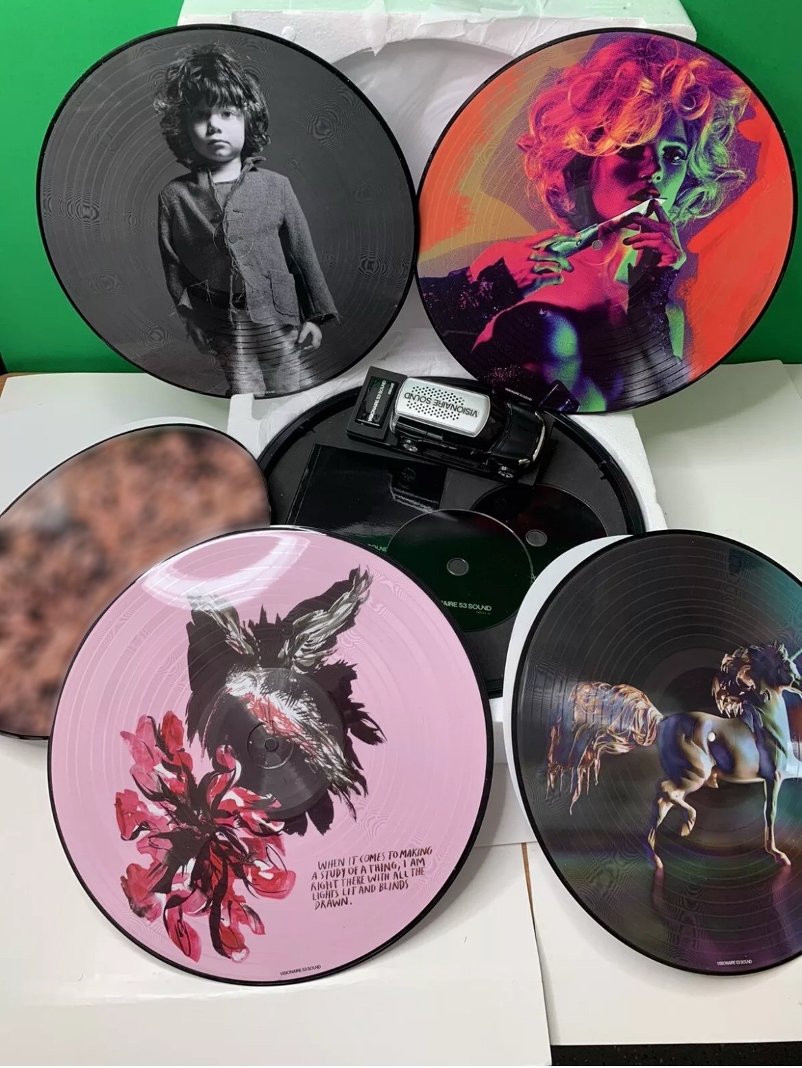 Visionaire No. 53 is the 53rd “issue” of Visionaire, an American art and fashion periodical. #53 was published on five 12" vinyl records in a sleek black UFO-shaped capsule. Each record is a picture disc featuring a commissioned piece of original artwork per side.